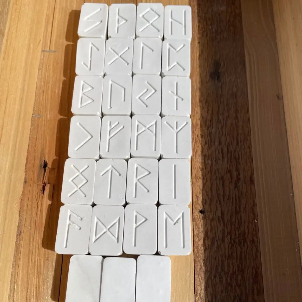Ein vollständiges **Runenset** aus dem Elder Futhark — alle 24 Runen, einzeln aus Material gefertigt, im Beutel oder Kästchen geliefert.